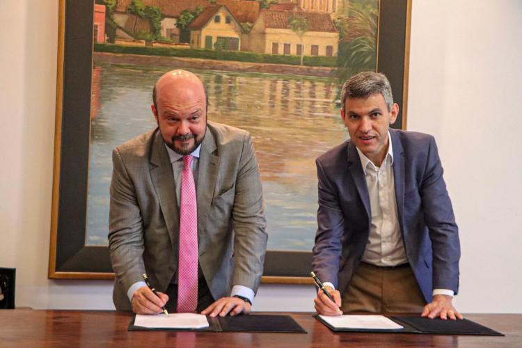 O presidente da Coordenação da Região Metropolitana de Curitiba (Comec) Gilson Santos e o reitor da Universidade Federal do Paraná, Ricardo Marcelo Fonseca, assinaram nesta sexta-feira (11/01) um termo de cooperação técnica entre Comec e UFPR com a intenção de promover ações que contribuam para o desenvolvimento sustentável da Região Metropolitana de Curitiba.