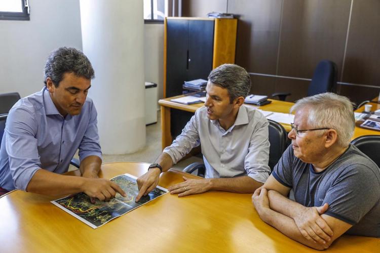 O presidente da Comec Gilson Santos e o técnico de planejamento Milton Campos se reuniram nesta sexta-feira (08) com o Diretor Geral da Secretaria de Estado de Infraestrutura e Logística - Seil, Fernando Furiatti, para falar sobre o histórico do Contorno Norte e o traçado que liga a PR-418 (Rodovia da Uva) a Rodovia Régis Bittencourt, no município de Colombo.