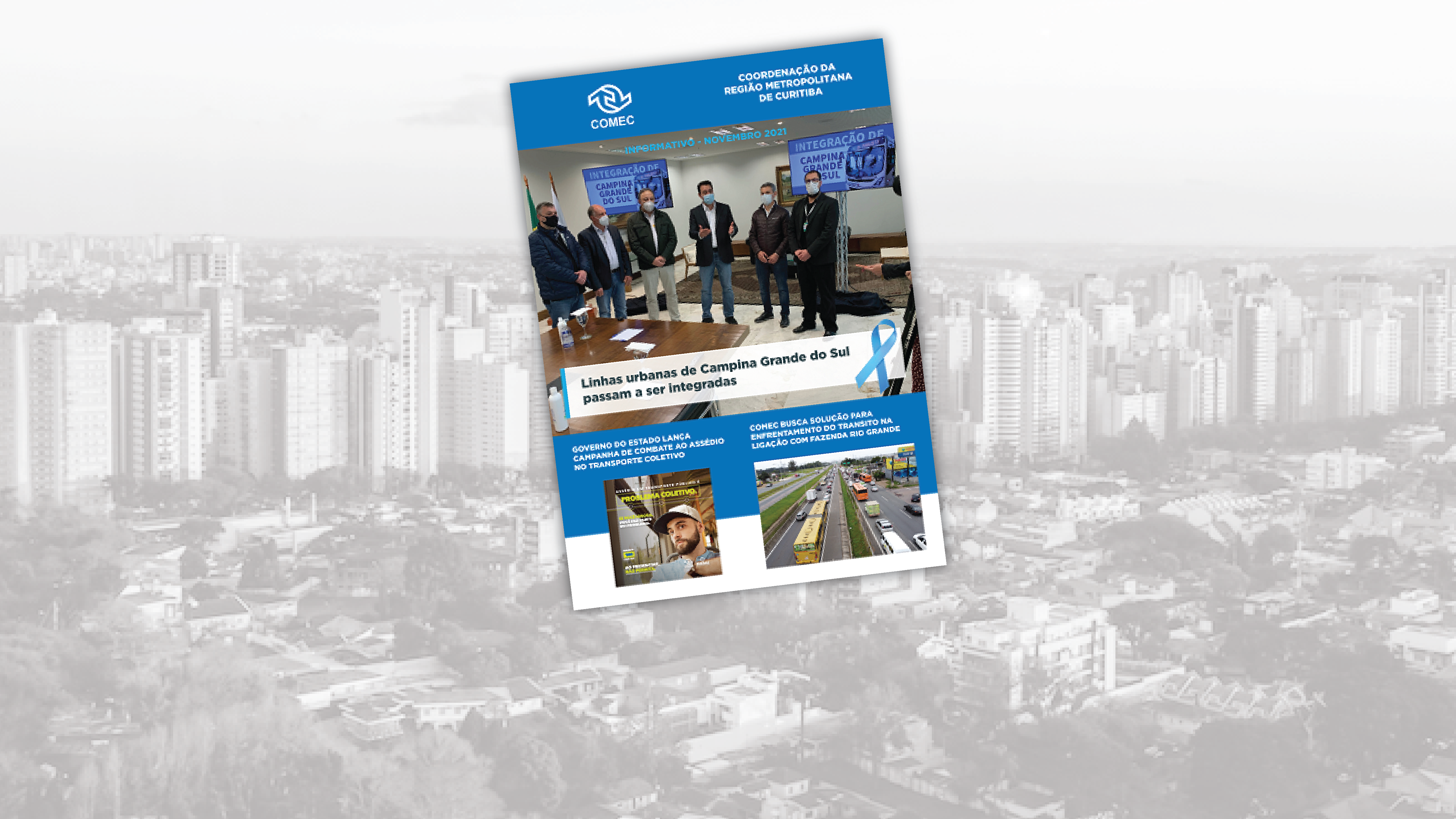O Informativo Comec do mês de Novembro traz como destaques a nova integração das linhas de Campina Grande do Sul ao sistema metropolitano de transporte, o lançamento da campanha contra o assédio dentro do transporte coletivo e os estudos da Comec para melhoria do tráfego entre Fazenda Rio Grande e Curitiba.