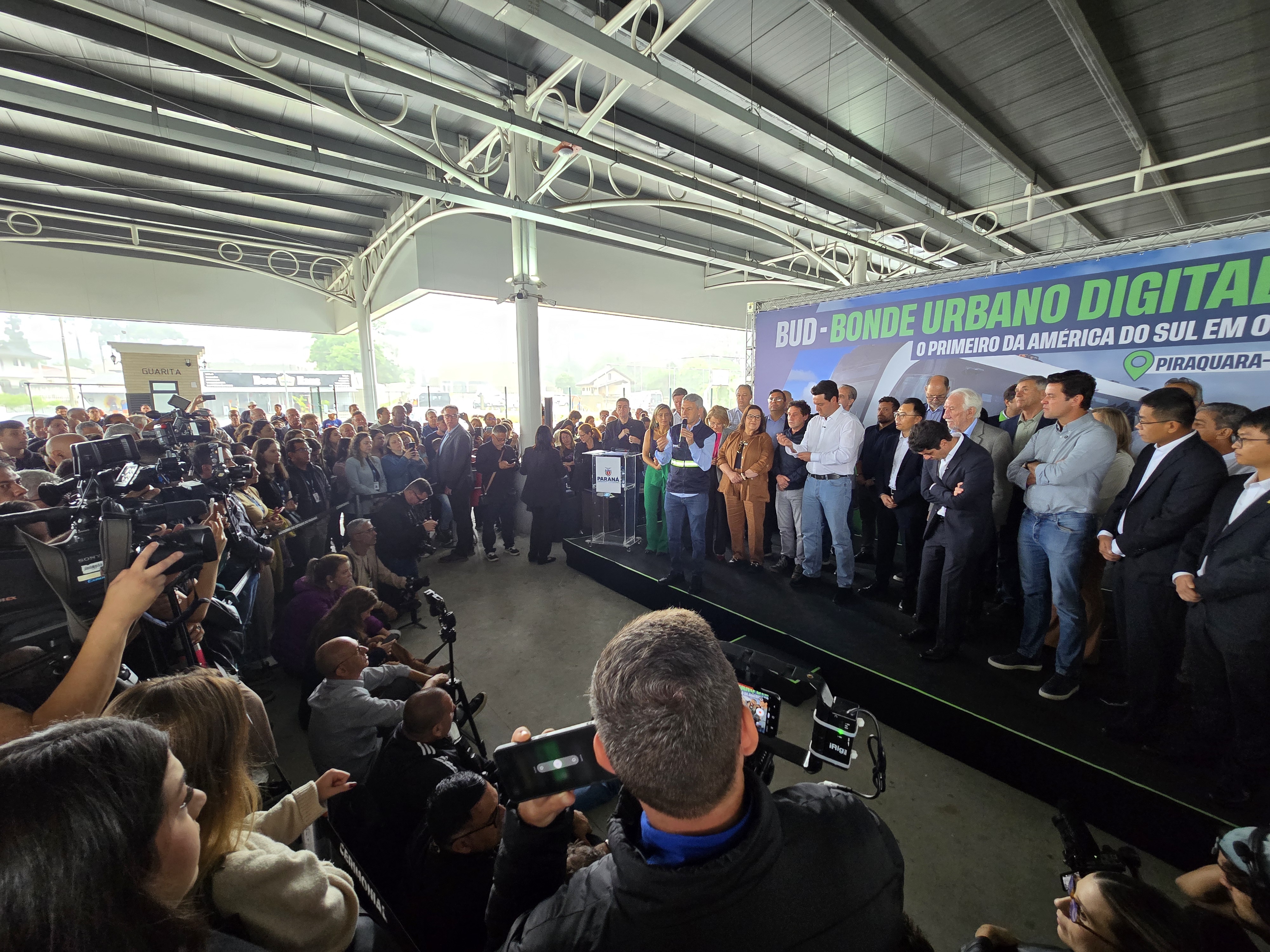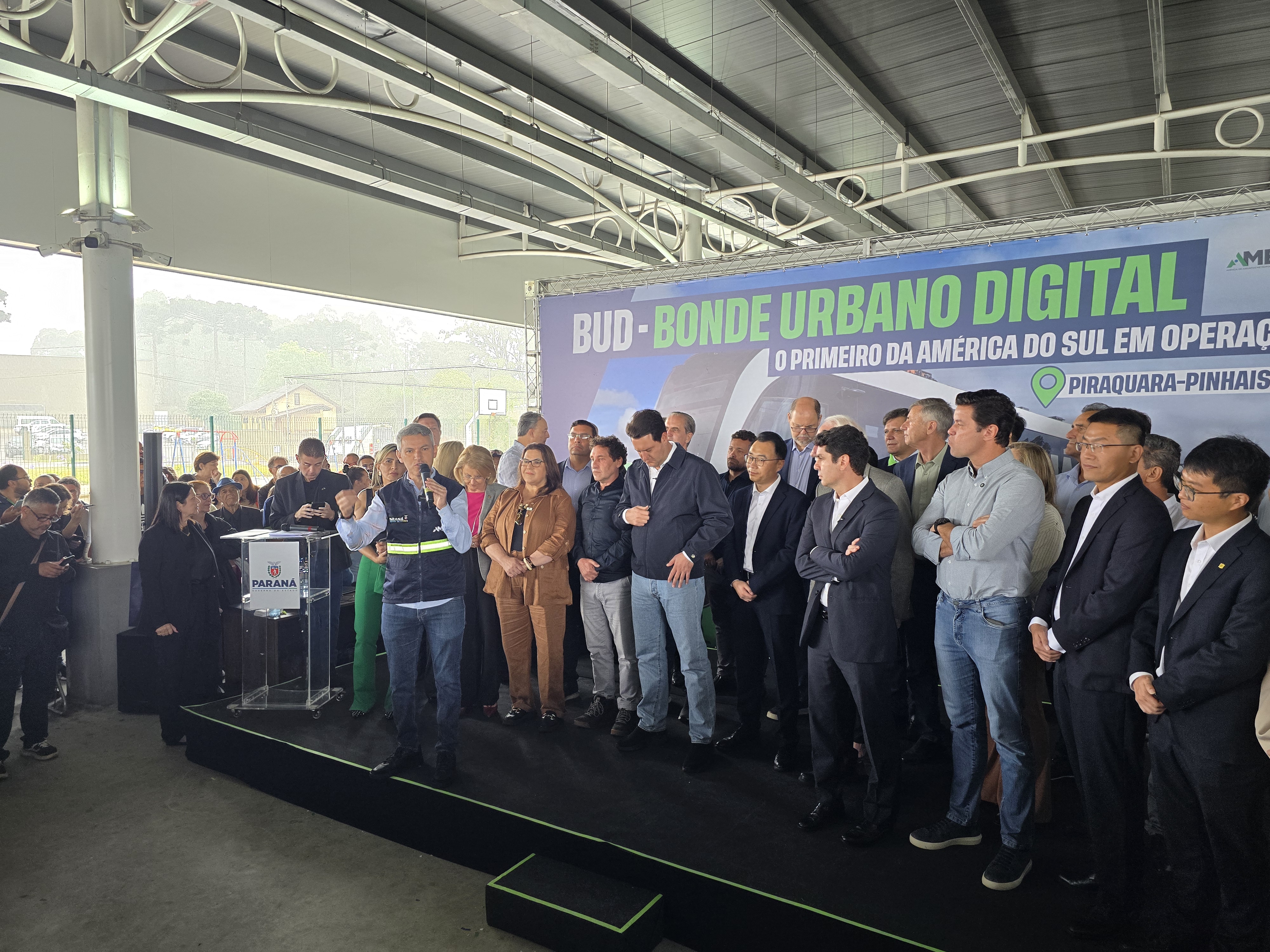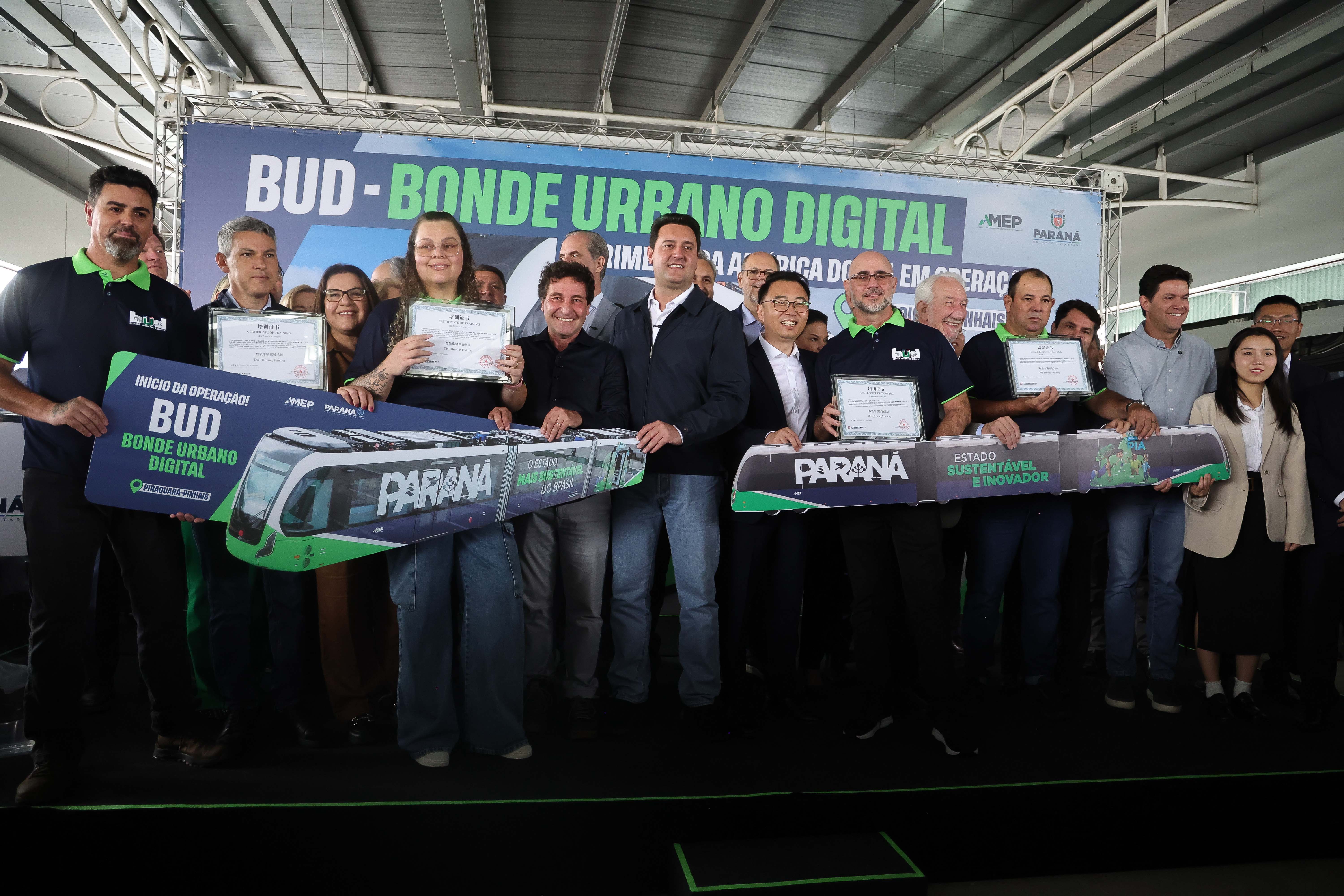 O Bonde Urbano Digital (BUD), inovação no transporte público na América do Sul, teve a sua primeira viagem realizada nesta terça-feira (09) com a presença do governador Carlos Massa Ratinho Junior. A rota inicial levará os passageiros entre o Terminal São Roque, em Piraquara, e o Parque das Águas, em Pinhais, ambos na Região Metropolitana de Curitiba (RMC). Já na próxima semana, o itinerário será estendido até o Terminal de Pinhais.